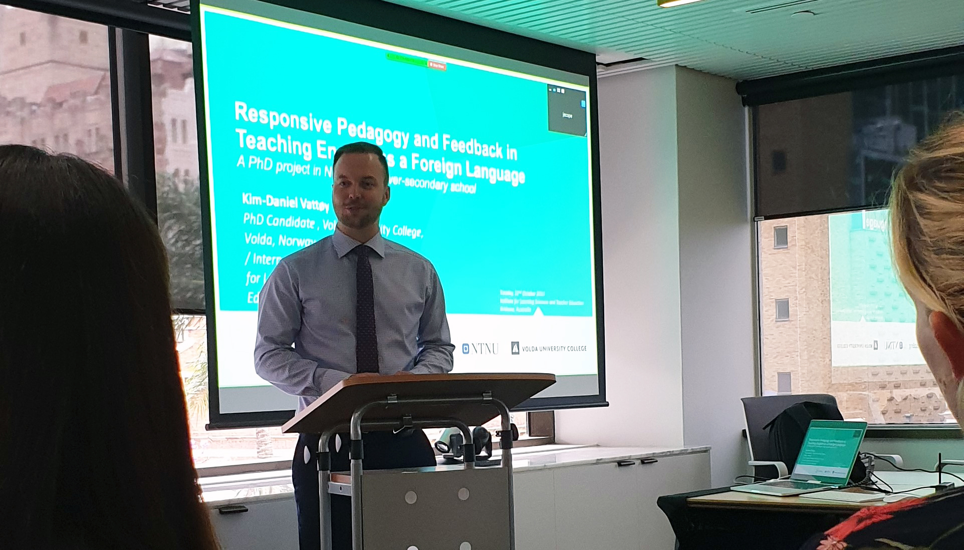 Ei moglegheit til å presentere ph.d.-prosjektet mitt og få tilbakemelding frå kollegaar ved ILSTE opna seg tidleg. Eg vart invitert til å halde ein presentasjon i førelesingsserien, «ILSTE Brown Bag Series». Dette var svært givande og det utfordra meg til å diskutere funna mine frå dei tre artiklane mine av ph.d.-en min om «Responsiv pedagogikk og elevlæring i engelskundervisinga». Eg fekk mange gode tips og innspel om korleis styrke internasjonal relevans og samstundes idear om korleis drøfte implikasjonar av ph.d.-prosjektet mitt.