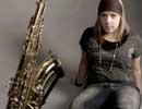 Ingrid Sæbø på tenorsaxofon med band presenterer sin bachelorkonsert ”Something old, something new, something borrowed, something blue!” i tradjazzens stil.