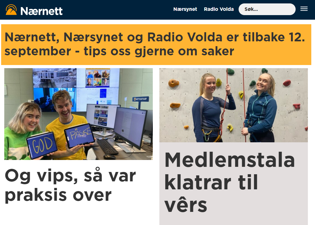 No kan du lese Nærnett, høyre på Radio Volda og sjå Nærsynet att. Journaliststudentane i Volda har mykje praksis året rundt - og startar altså ei ny periode måndag 12. september. Dei lover gode nyheitssaker, undersøkande journalistikk og underhaldning - og tek gjerne imot tips og tilbakemeldingar!