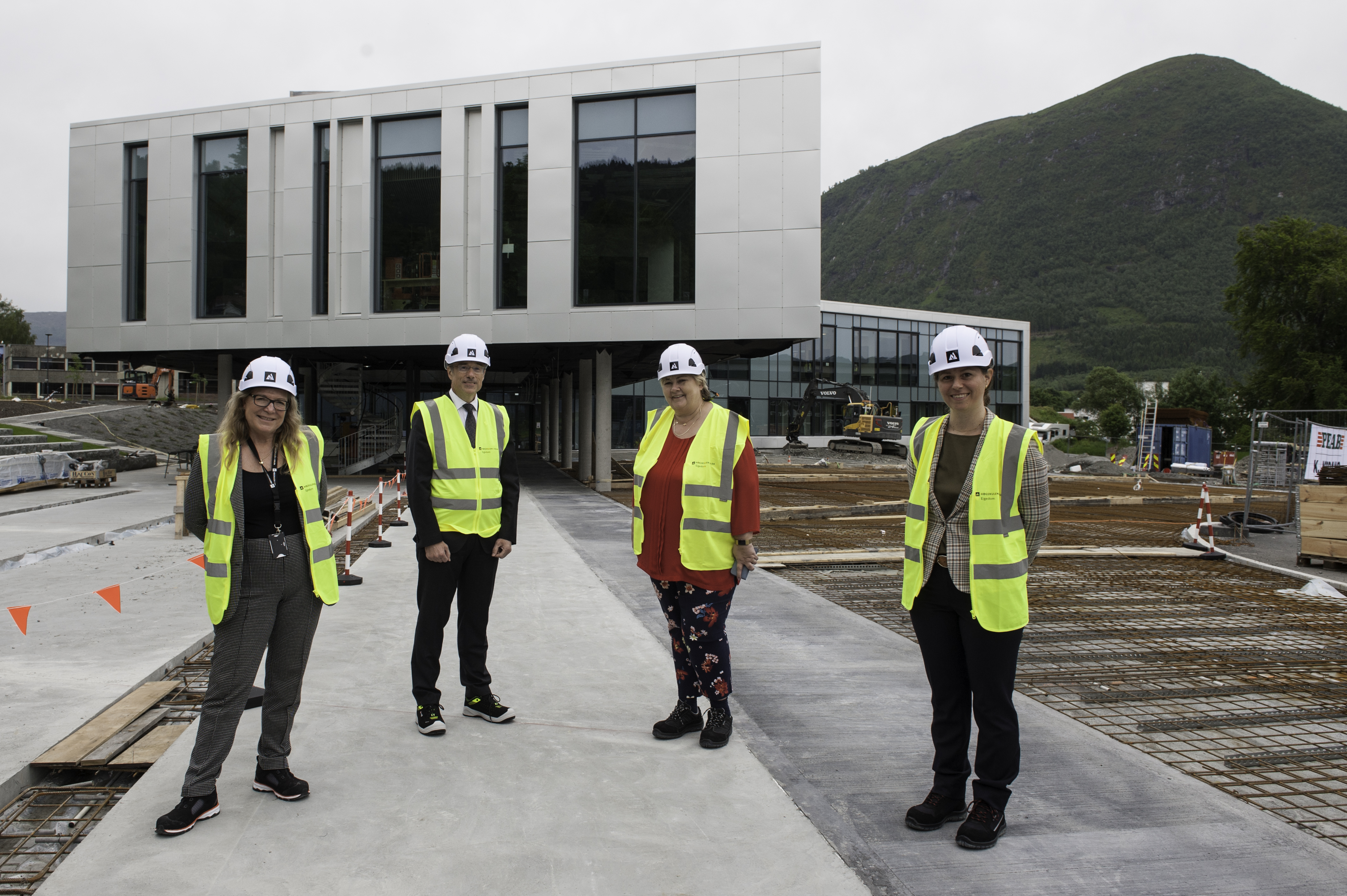 Frå venstre: Dekan for Avdeling for mediefag Kate Kartveit, rektor Johann Roppen, statsminister Erna Solberg, direktør Karen Lomeland Jacobsen.