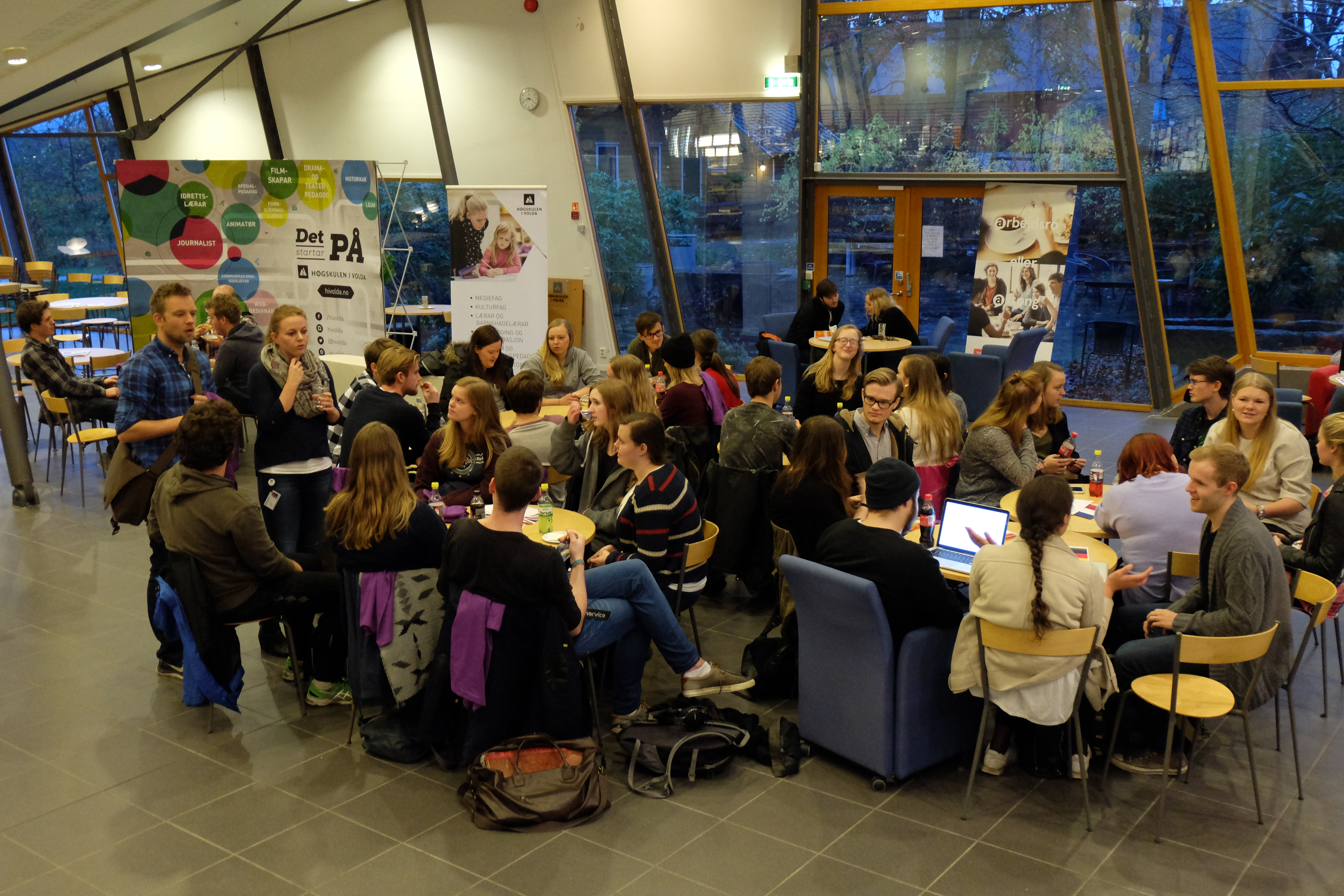 HVO-studenter og internasjonale studenter møttes for erfaringsutveksling i kantina onsdag ettermiddag.