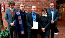 Sentrale personar i disputasen. Frå venstre: Professor Gunnar Liestøl (1. opponent), prodekan Bjørn Kåre Myskja (NTNU), Pål Aam, lektor Ida Willig (2. opponent) og Svein Høier (3. opponent). Foto: Johann Roppen.